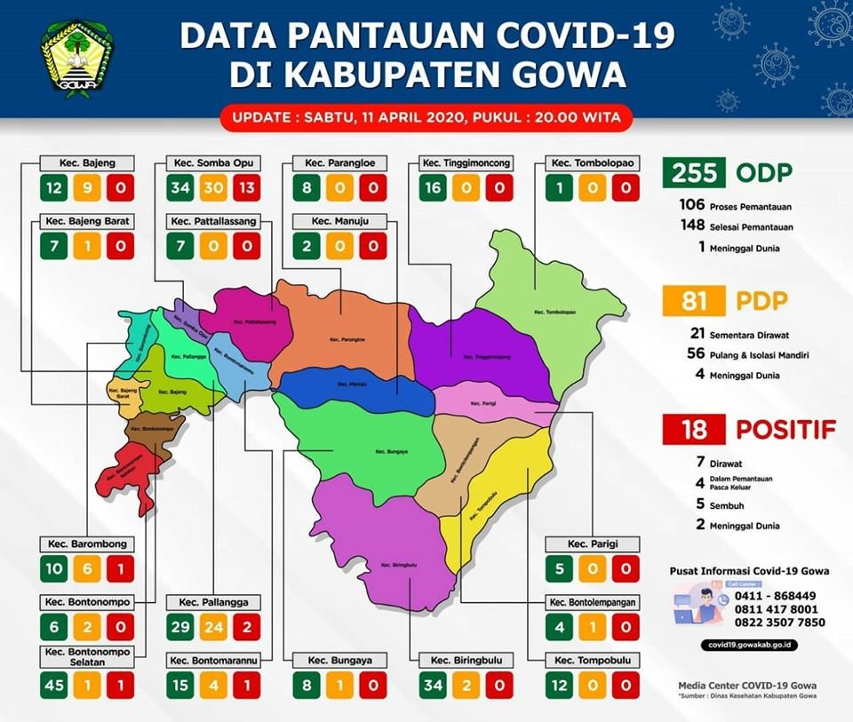 Sebanyak 121 desa dari 18 kecamatan di dataran rendah dan dataran tinggi Kabupaten Gowa hingga saat ini telah memberlakukan Pembatasan Sosial Berskala Kecil ini sebagai upaya melindungi masyarakatnya dari penyebaran dan penularan Covid-19.