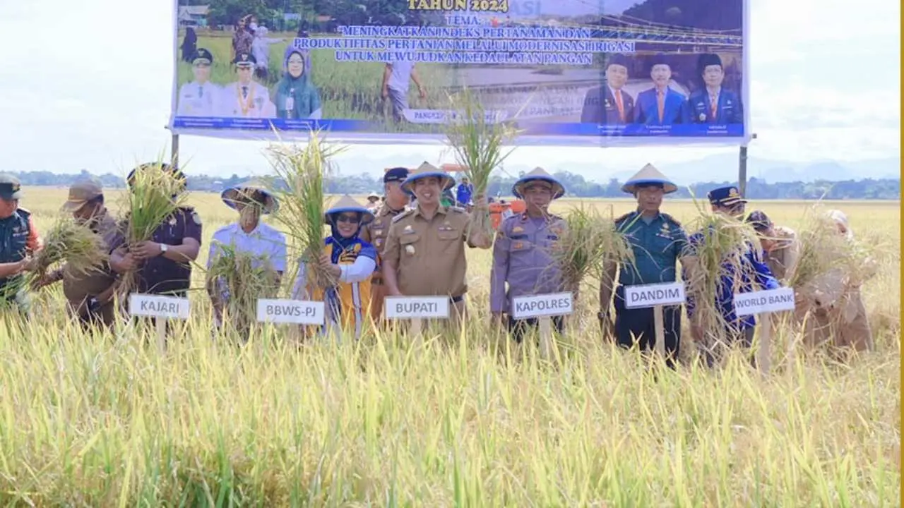 PANGKEP—Bupati Pangkep, Muhammad Yusran Lalogau (MYL) panen raya padi musim tanam II, daerah irigasi Tabo-tabo, dirangkaikan rapat koordinasi Komisi Irigasi, Senin (5/8/2024).