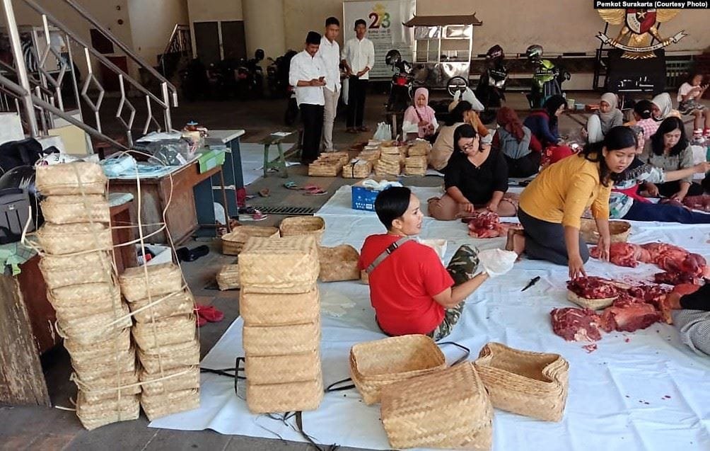 SOLO — Sejumlah penyedia jasa penyembelihan dan penjualan hewan kurban di Solo pada Hari Raya Iduladha yang jatuh pada Minggu (11/8), menyediakan bungkus dari bahan ramah lingkungan, seperti daun pisang dan besek atau kotak dari anyaman bambu, sebagai pengganti kantong plastik.