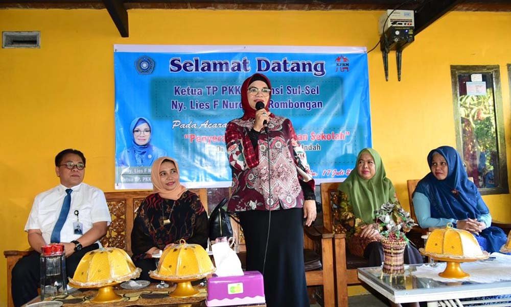 MAKASSAR – Menyambut tahun ajaran baru, Ketua TP PKK Sulsel, Lies F Nurdin, kembali turun membagikan perlengkapan sekolah kepada ratusan anak usia sekolah dasar. Terdiri dari tas sekolah, alat tulis, sarung, beserta snack sehat