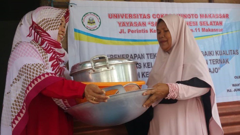 Dosen Universitas Cokroaminoto Makassar (UCM) Wahyuti SPi MSi dan Ir Juni Astuti MSi mengajari warga memanfaatkan ampas kelapa sebagai limbah industri atau limbah rumah tangga menjadi pakan ayam.
