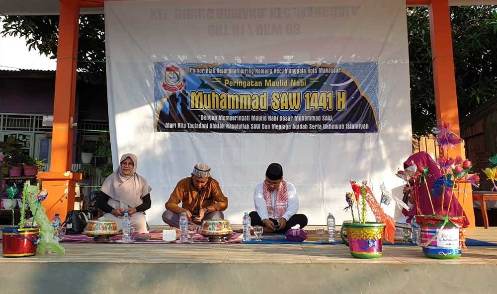 MAKASSAR, Ratusan Warga kelurahan Biring Romang, Kecamatan Manggala, kota Makassar memadati gelaran Peringatan Maulid Nabi Muhammad SAW, yang di gelar di Lapangan Taman Hakim, ORT. 01, ORW. 03, Bumi Antang Permai Makassar, Minggu (24/2).
