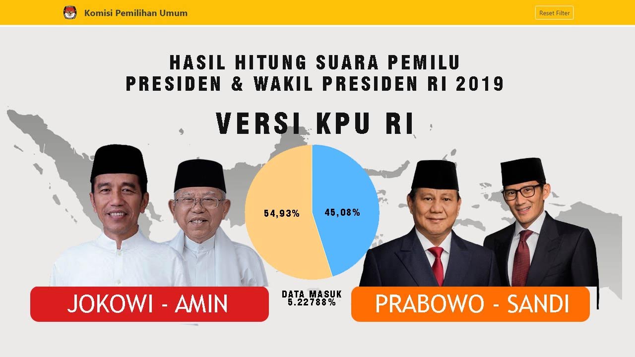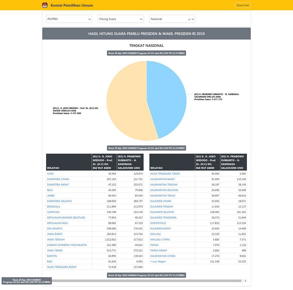 Per tanggal 20 April 2019 pukul 20:14 WIB, pasangan calon presiden dan wakil presiden nomor urut 01, Joko Widodo-Ma’ruf Amin berhasil memperoleh 54,93% suara, Sedangkan pasangan Prabowo Subianto-Sandiaga Uno, mendapat 45,08%.