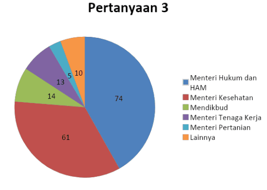 Dari hasil survei pada pertanyaan ketiga, menunjukkan bahwa 74 responden memilih Menteri Hukum dan HAM yang di duduki oleh Yasonna H Laoly sebagai menteri paling dominan diancangkan reshuffle oleh responden.