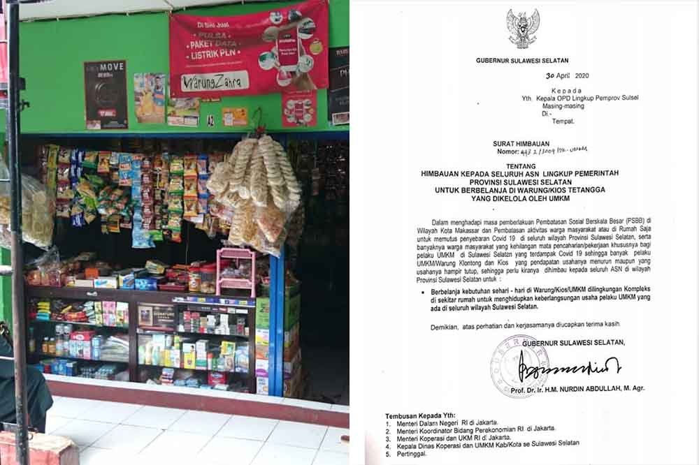 Menyikapi hal ini Gubernur Sulsel Nurdin Abdullah mengeluarkan surat himbauan bernomor 4432/3004/DK-UMKM yang ditujukan kepada seluruh ASN lingkup Pemprov Sulsel untuk berbelanja di warung atau kios tetangga. Terutama yang berbasis UMKM.