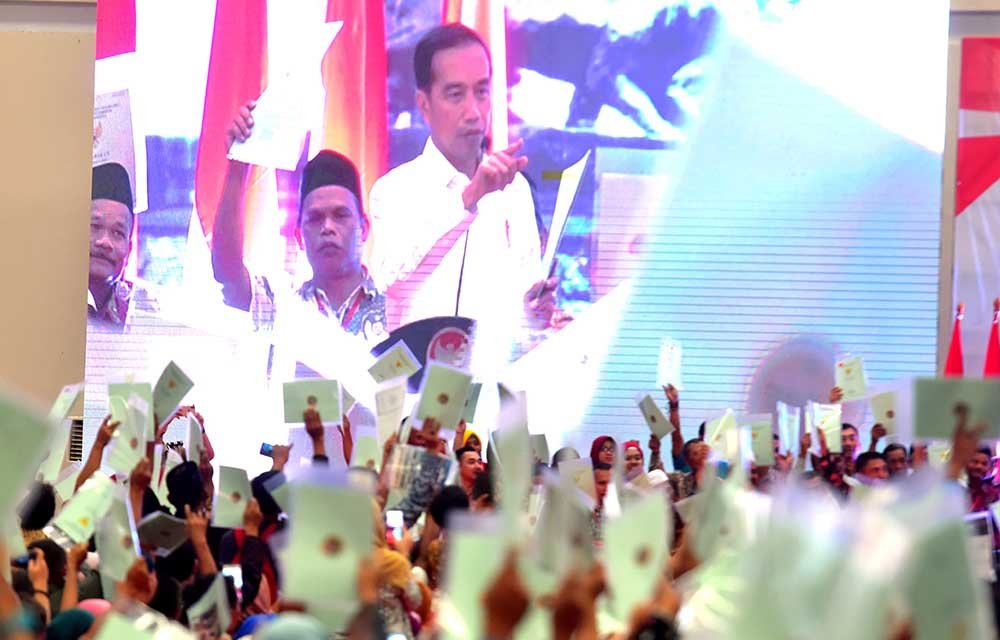 “Sertifikat ini adalah tanda bukti hak hukum atas tanah yang kita miliki,” kata Presiden Jokowi sambil mengangkat satu sertifikat.