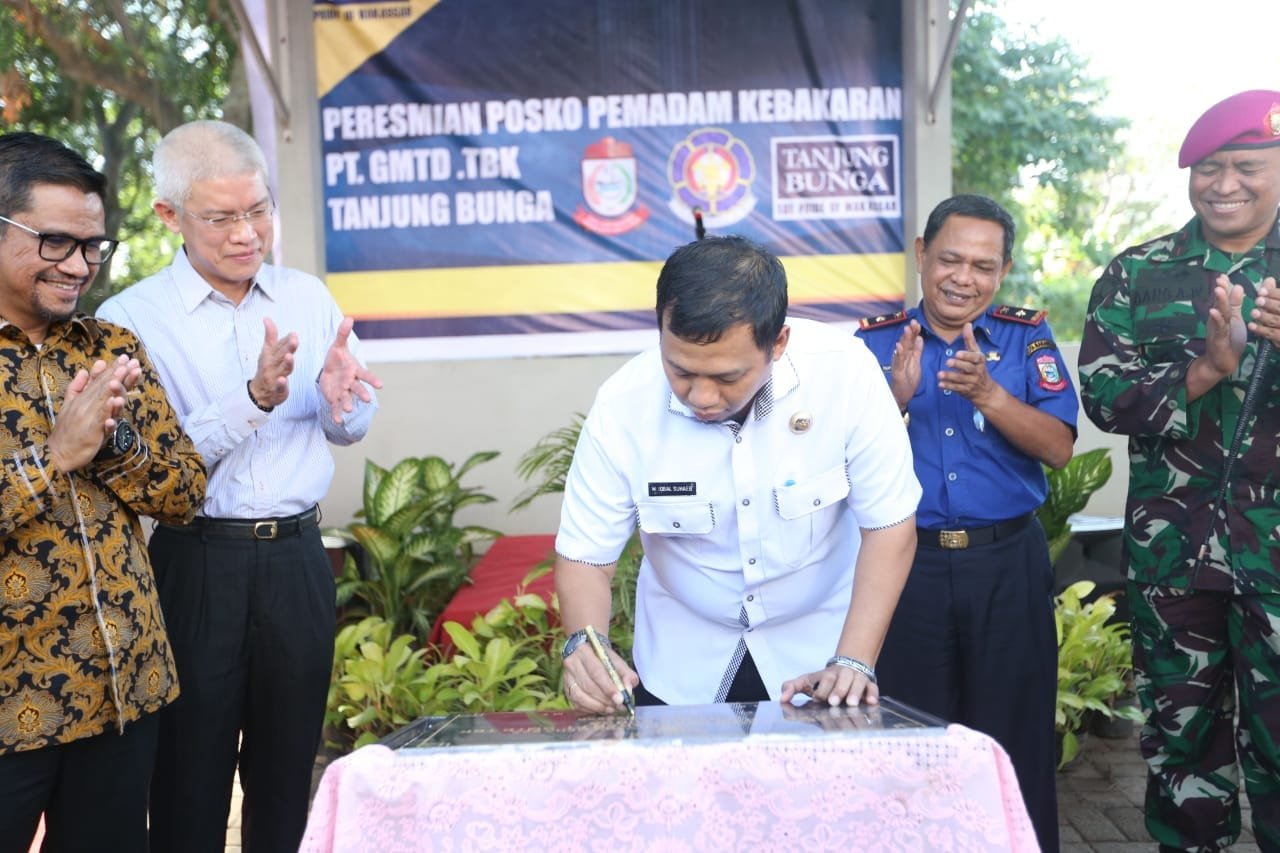 MAKASSAR,- Pj Wali Kota Makassar Iqbal Suhaeb menghadiri peresmian Pos Komando Pemadam Kebakaran (Damkar) Kota Makassar yang ditandai dengan penandatangan prasasti di Markas Komando Security PT GMTD Tbk, Jalan Metro Tanjung Bunga Makassar, Rabu (7/8/2019).