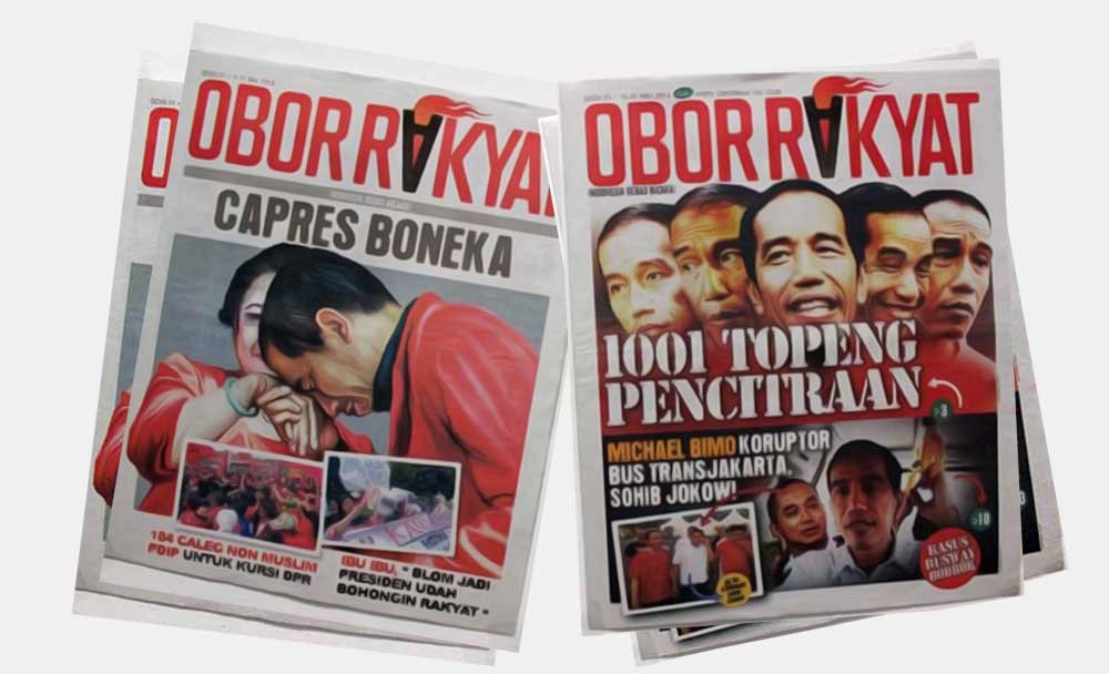 Pada Juni 2014, tim pemenangan capres dan cawapres Joko Widodo-Jusuf Kalla melaporkan Tabloid Obor Rakyat ke Badan Pengawas Pemilu (Bawaslu) karena menerbitkan tulisan berjudul ‘1001 Topeng Jokowi’.