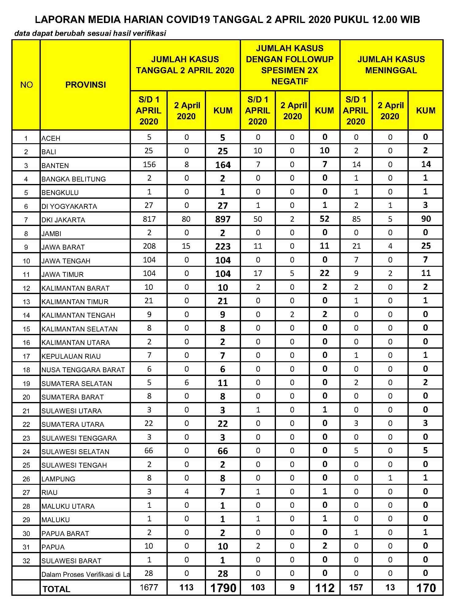 Pada Kamis (2/4) Gugus Tugas merincikan data positif COVID-19 di Indonesia yaitu Provinsi Aceh sebanyak lima kasus, Bali (25 kasus), Banten (164 kasus), Bangka Belitung (dua kasus), Bengkulu (satu orang), DI Yogyakarta (27 kasus), DKI Jakarta (897 kasus).