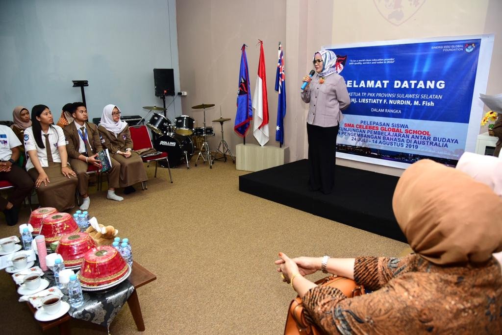 MAKASSAR – Ketua Tim Penggerak PKK Sulawesi Selatan Lies F Nurdin melepas 27 siswa serta staf 4 pengajar SMA Celebes Global School (CGS) Makassar yang akan melakukan studi budaya dan pengembangan bahasa di Australia 27 Juli hingga 14 Agustus mendatang.