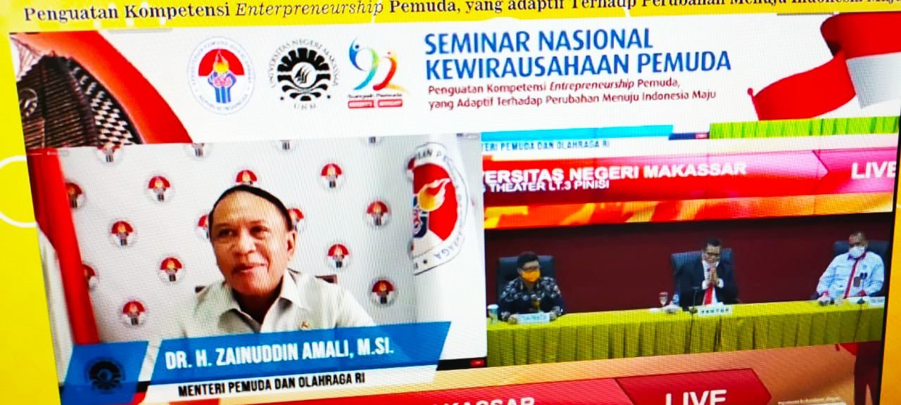 Menteri Pemuda dan Olahraga Zainuddin Amali, menjadi narasumber pada seminar nasional kewirausahaan pemuda dalam rangka menyambut peringatan sumpah pemuda, yang di laksanakan melalui daring dan luring. Di Gedung Pinisi UNM, Selasa (27/10/2020).