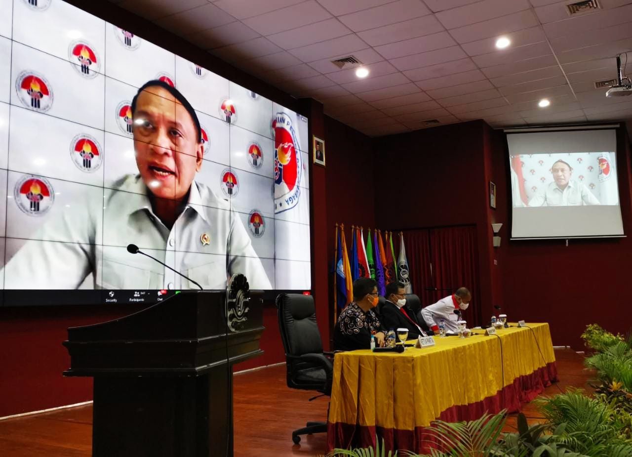 Menteri Pemuda dan Olahraga Zainuddin Amali, menjadi narasumber pada seminar nasional kewirausahaan pemuda dalam rangka menyambut peringatan sumpah pemuda, yang di laksanakan melalui daring dan luring. Di Gedung Pinisi UNM, Selasa (27/10/2020).