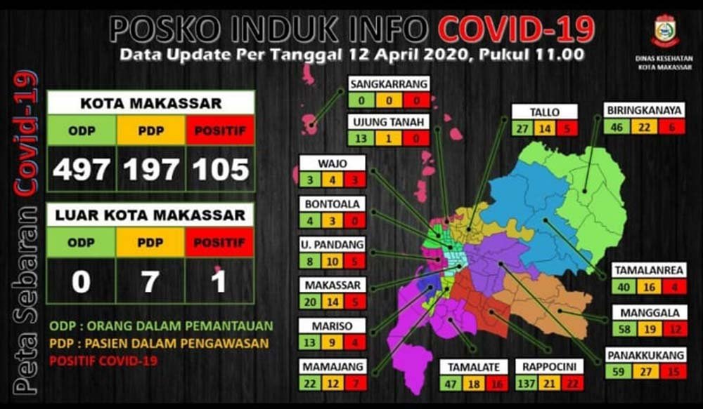 Untuk diketahui, berdasarkan data yang diperoleh Media Sulsel di Media Center Tim Penanggulangan Covid-19 kota Makassar, secara menyeluruh jumlah pasien Covid-19 per tanggal 11 April dengan status ODP sebanyak 474 orang dengan 354 orang masih dalam proses pemantauan, sedangakan 120 orang selesai pemantauan.