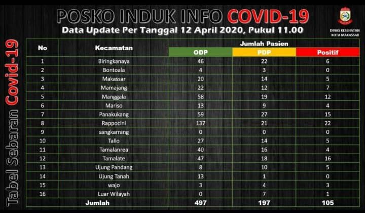 Jika ditilik dari tabel data update per tanggal, 12 April 2020, Posko Induk Covid-19 Kota Makassar, tak ayal lagi kecamatan Manggala dengan pasien ODP 58 orang, PDP 19 orang dan positip 12 orang, menjadi kecamatan berpasien terbanyak keempat di kota Makassar setelah Rappocini, Panakkukang dan Tamalate, menjadi layak masuk jajaran 4 kecamatan diberlakukan PSBK.