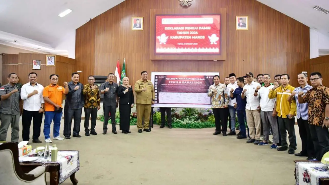 MAROS—Penjabat Gubernur Sulsel, Bahtiar Baharuddin, di Kabupaten Maros menghadiri empat kegiatan. Diantaranya, Penandatanganan Bersama Naskah Perjanjian Hibah Daerah (NPHD) antara KPU Maros dan Pemkab Maros, serta Bawaslu Maros dan Pemkab Maros di Ruang Aula Kantor Bupati Maros, Senin, 2 Oktober 2023. Selain iti juga dilaksanakan Deklarasi Pemilu Damai.