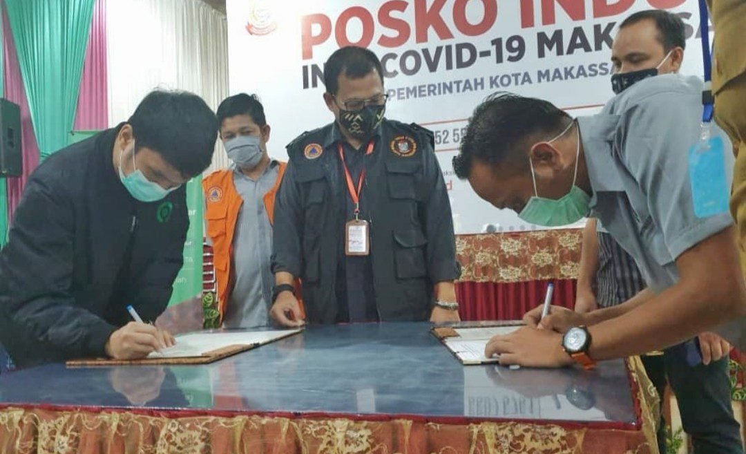 MAKASSAR,- Penjabat Wali Kota Makassar Iqbal Suhaeb menyaksikan penandatangan nota kesepahaman antara Direktur Utama PD. Pasar Makassar Raya, Basdir dan District Head Makassar PT. Aplikasi Karya Anak Bangsa, Adwin Pratama Anas, tentang program pengembangan perdagangan secara daring bagi pelaku usaha di lingkungan pengelolaan PD Pasar Makassar Raya, di Posko Induk Info Covid 19 Pemerintah Kota Makassar, Jalan Nikel, Selasa (14/4).
