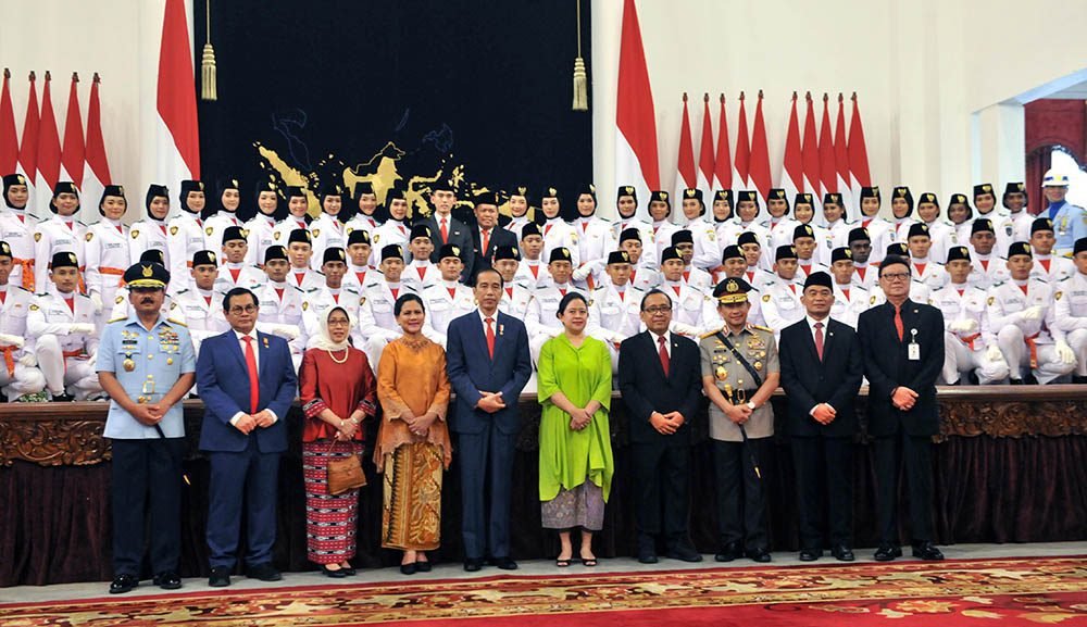 JAKARTA – Presiden Joko Widodo (Jokowi) mengukuhkan 68 anggota Pasukan Pengibar Bendera Pusaka (Paskibraka) dari 34 provinsi yang akan bertugas pada peringatan Hari Kemerdekaan ke-74 Republik Indonesia, di Istana Negara, Jakarta, Kamis (15/8).
