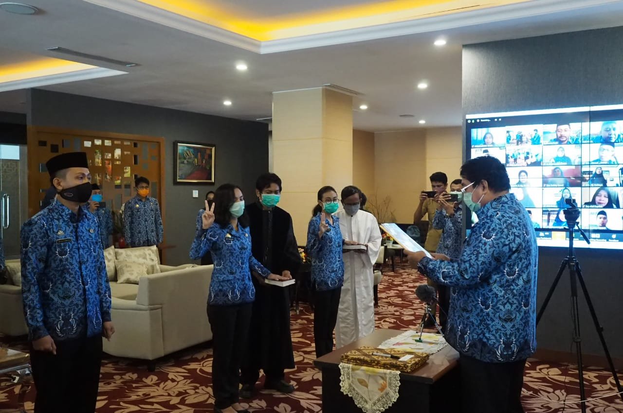 MAKASSAR, Sekretaris Daerah Provinsi Sulsel, Abdul Hayat Gani, mengambil sumpah atau janji 500 ASN melalui media teleconference, di Baruga Lounge Kantor Gubernur, Selasa, 28 April 2020.
