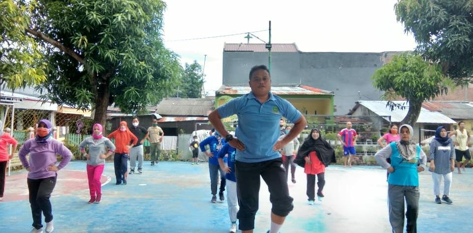 Makassar, Babinsa Kelurahan Biring Romang, kecamatan Manggala, kota Makassar, Serma Syahrullah, turut serta membaur dalam senam Corona yang dihelat pemerintah kelurahan Biring Romang di lapangan Taman Hakim, RT. 01/ RW. 03, Sabtu (6/6).