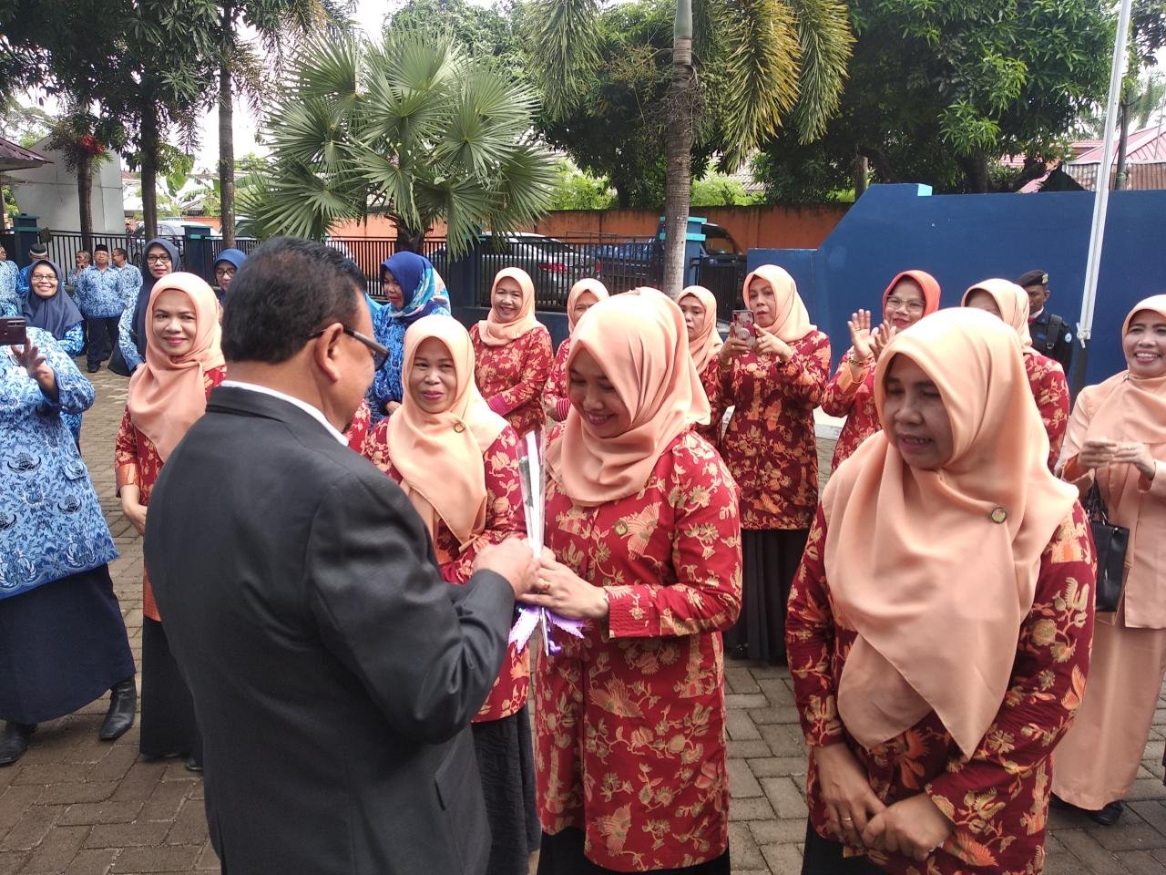Usai menyanyikan lagu Ibu itu, dilanjutkan pemberian kembang bunga kepada ibu-ibu peserta upacara, dimulai dari Prof Jasruddin diserahkan kepada isterinya, Dra. Soperi Eny.