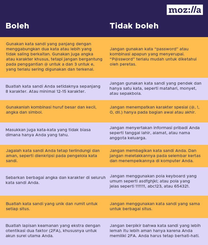 Kata sandi yang kuat adalah garis pertahanan terhadap upaya peretasan dan akses yang tidak sah atau tidak memiliki izin pada akun Anda. Berikut adalah beberapa tips untuk memperkuat kata sandi dari Mozilla: [Baca lebih lanjut tentang cara membuat kata sandi yang kuat].