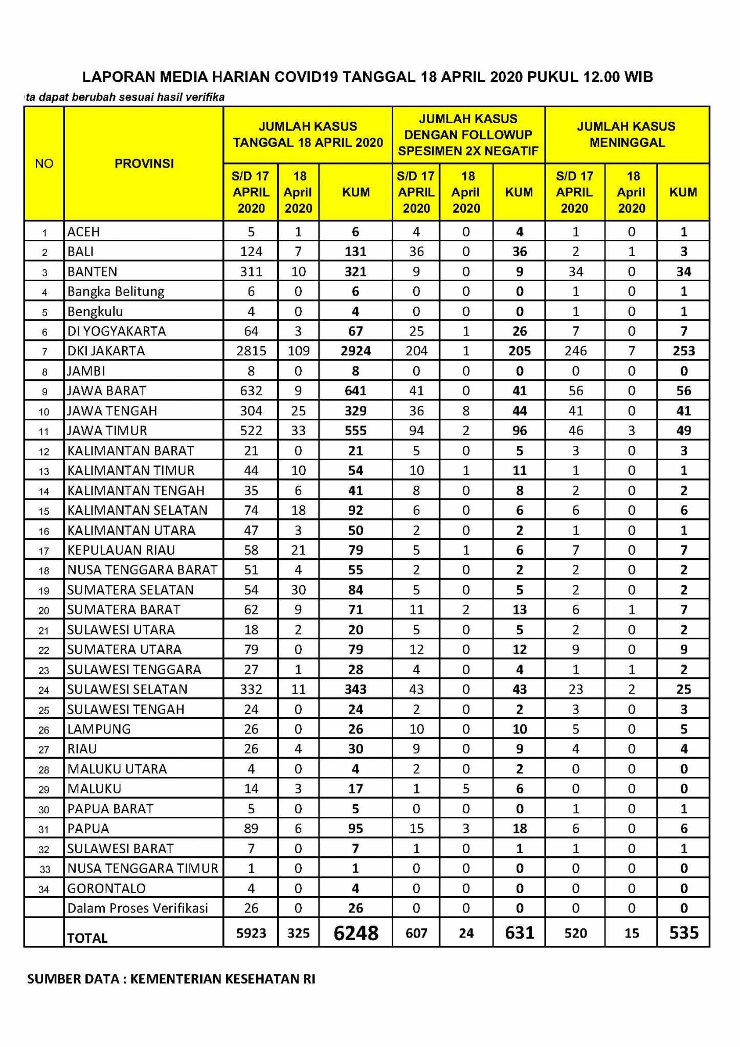 Dari total kasus sembuh dan meninggal tersebut, ada pula penambahan untuk kasus positif sebanyak 325 orang hingga total menjadi 6.248.