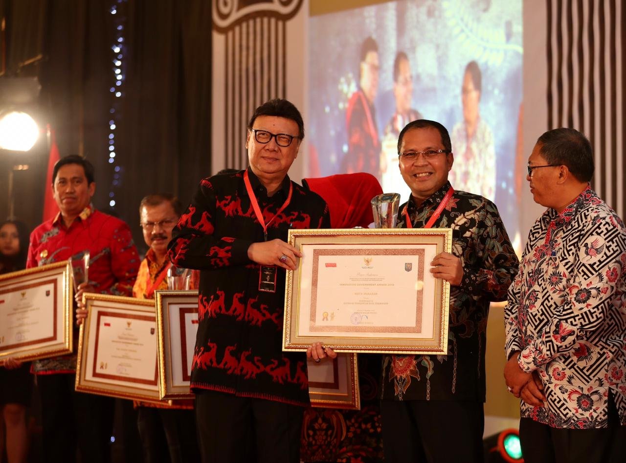 Penghargaan tersebut diserahkan langsung oleh Menteri Dalam Negeri, Tjahjo Kumolo kepada Wali Kota Makassar, Moh. Ramdhan “Danny” Pomanto pada acara Innovative Government Award (IGA) 2018 di Hotel Sahid Jaya, Jalan Jenderal Sudirman, Jakarta Pusat. Jumat (7/12/2018) malam.